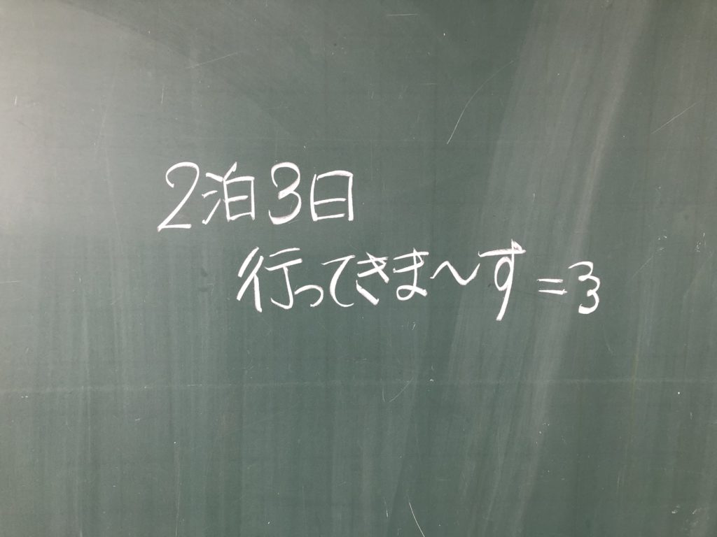 6年生教室をのぞいてみると・・・・・・黒板には「2泊3日行ってきます」の文字が。