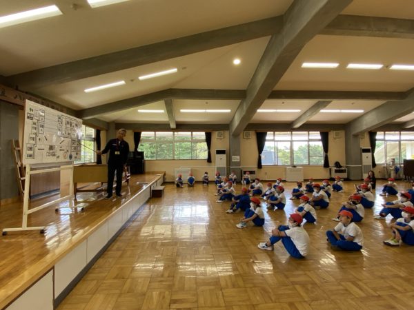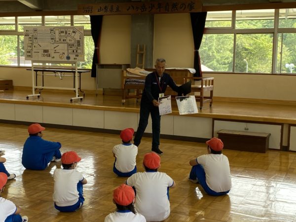 「自然が豊かで、たくさんの動物がいる」との話に子どもたちは興味津々でした。動物に出会うには、周りの様子をよく見ることが大切とのことです。