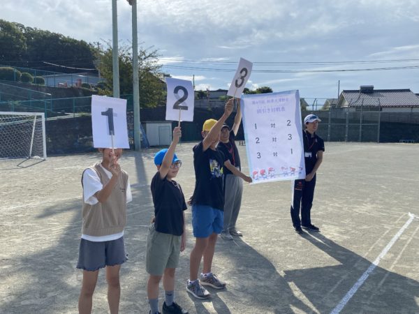 ラジオ体操後には,色組リーダーが「つなひき」の抽選を行いました。