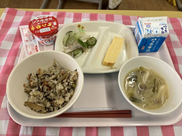 今日の献立は,牛乳,ひじきごはん,豆乳みそ汁,厚焼きたまご,キャベツのゆかりあえ,ヨーグルトでした。おいしくいただきました。