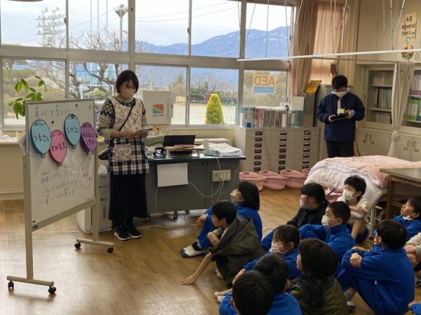 測定の前に,1月の保健目標『みんなとなかよくしよう』に関するお話をききました。