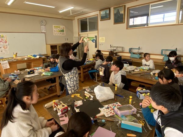 空き箱や竹ひご、波段ボールなどの材料を使って、それぞれが車作りに取り組んでいました。