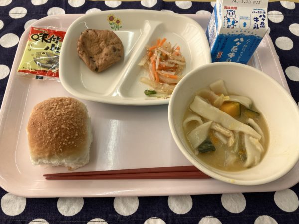 2024年1月23日 / 最終更新日時 : 2024年1月23日 明野小 全校 学校給食週間2日目 「学校給食週間」2日目のメニューは,牛乳,子どもパン,かぼちゃのほうとう,がんもどきのにもの,北杜市産だいこんサラダ、味付き小魚でした。 使用した地域食材は,北杜市産の大根、干ししいたけ,白菜,山梨県産の豚肉でした。おいしくいただきました。