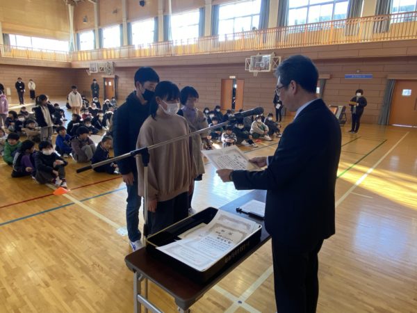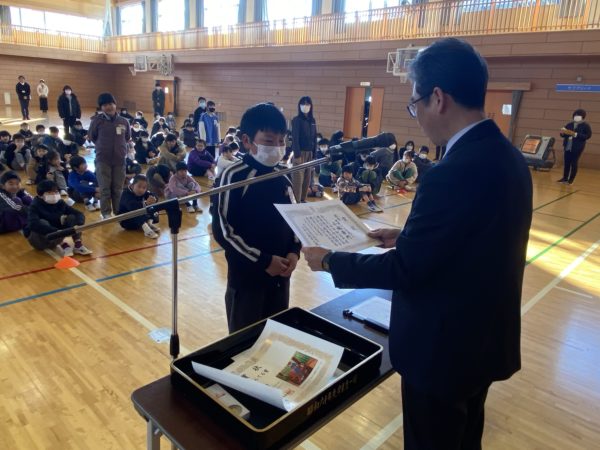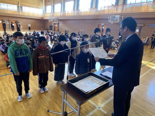 教育祭書き初め大会,八ヶ岳少年自然の家の思い出を描く作品展,全国児童画コンクールの入賞者への賞状伝達が行われました。