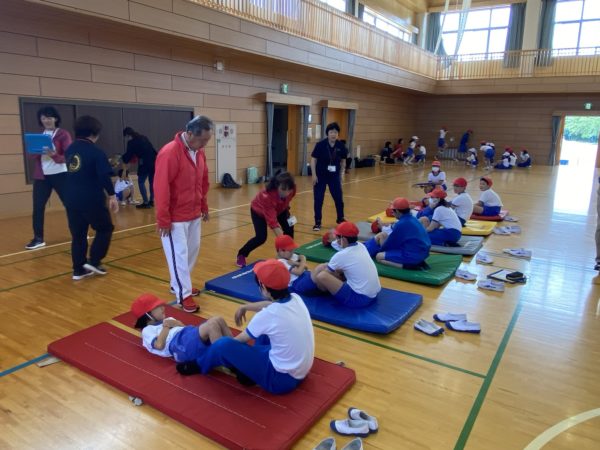 上体起こし、反復横跳び、立ち幅跳び、長座体前屈の4種目を行いました。