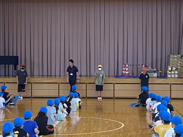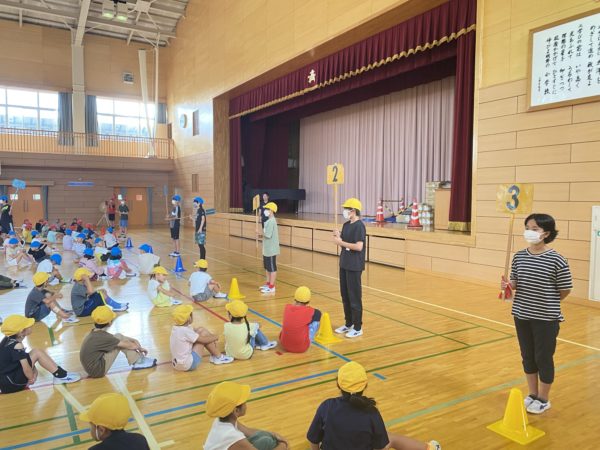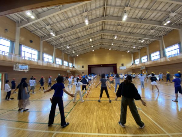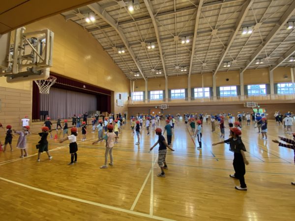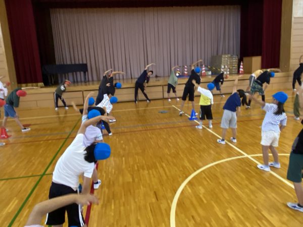 小雨が降っていたため,体育館でラジオ体操を行いました。