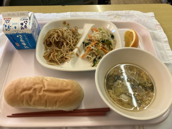 今日のメニューは牛乳、コッペパン、ソースやきそば、切り干し大根のバンバンジーサラダ、サンラータン、オレンジでした。おいしくいただきました。