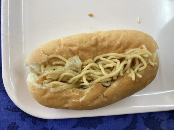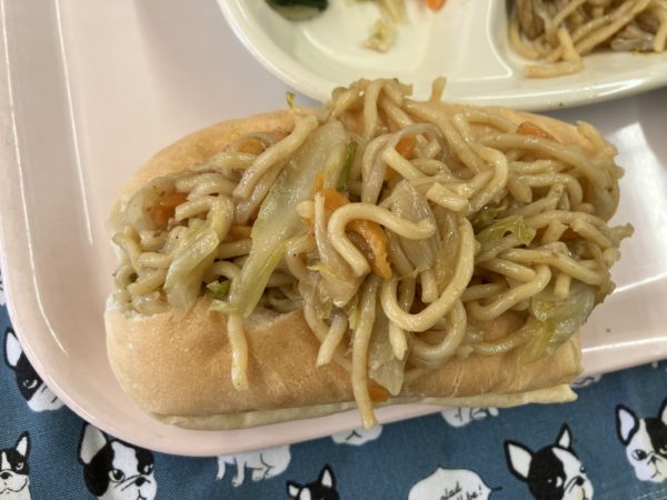 さて今日の給食はセルフ焼きそばパンでした。