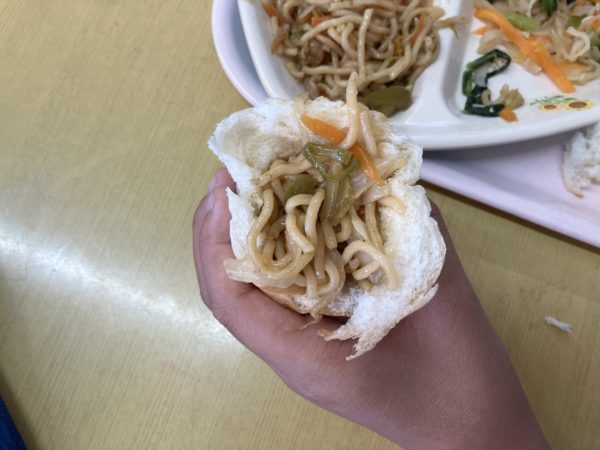 6年生教室をのぞいてみると、焼きそばをキレイにはさむ子、あふれんばかりにはさむ子、パンを筒状にして入れる子などなど、みんなそれぞれの食べ方を楽しんでいました。