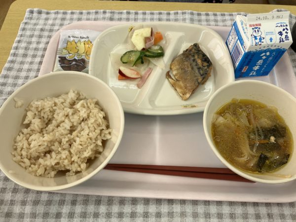 今日のメニューは牛乳、ちゃめし、ラーほう、大根とりんごのサラダ、サバの味噌に、黒糖ビーンズでした。おいしくいただきました。
