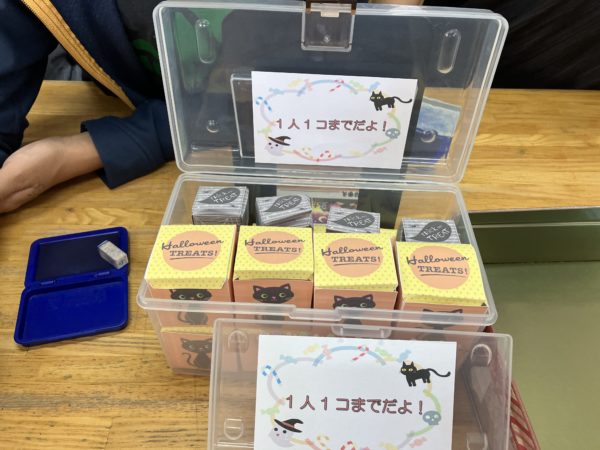 ハロウィンにちなんだ本を4冊借りると、図書委員が作った黒猫のお菓子入れがもらえます。