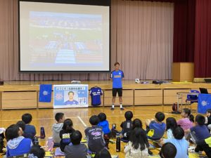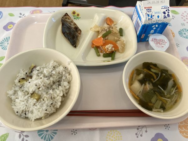 今日のメニューは牛乳、さつまいもご飯、ふのすまし汁、魚のみそ焼き、大根のいために、ミニピーチゼリーでした。