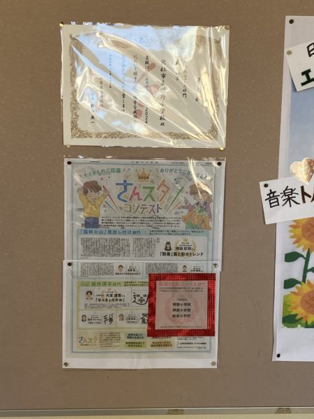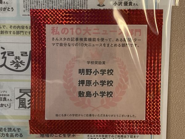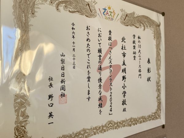 2024年12月17日 / 最終更新日時 : 2024年12月17日 明野小 5年生 さんスタコンテスト学校奨励賞 山梨日日新聞が開催した 「さんスタコンテスト2024 私の10大ニュース部門」 のおいて,明野小学校が 『学校奨励賞』 を受賞しました。 11月23日の山日新聞朝刊でも紹介されました。 このコンテストには,本校では主に5年生が取り組みました。 一生懸命取り組んだ姿を評価していただき,大変ありがたく思います。 ※「さんスタ」とは,山梨日日新聞社が提供している新聞活用学習支援サイトです。
