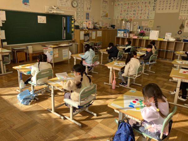 その間,子ども達は1年教室でお話を聞く授業を受けたり,塗り絵をしたり,図書室を見学したりと明野小の入学体験を行いました。