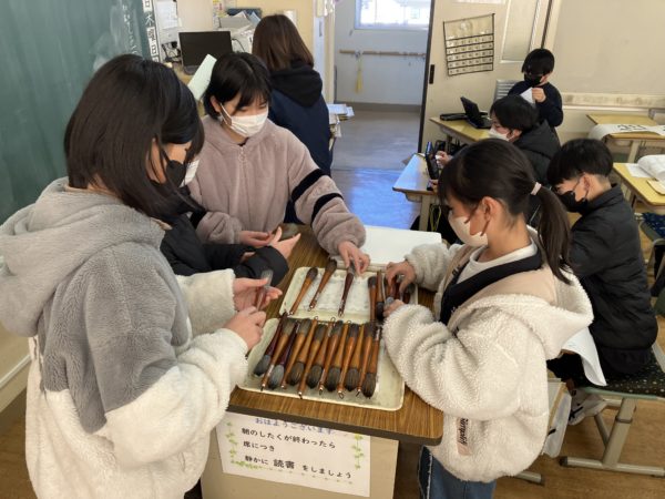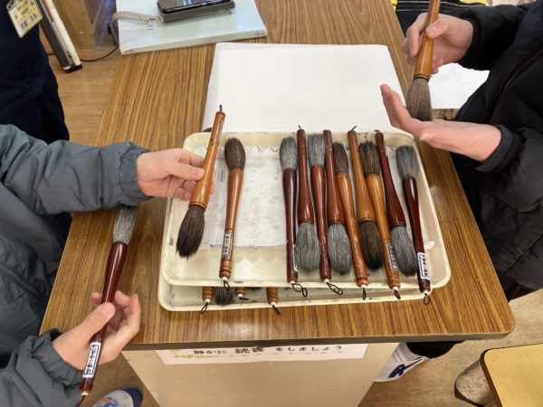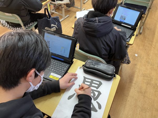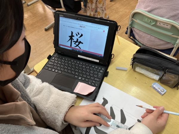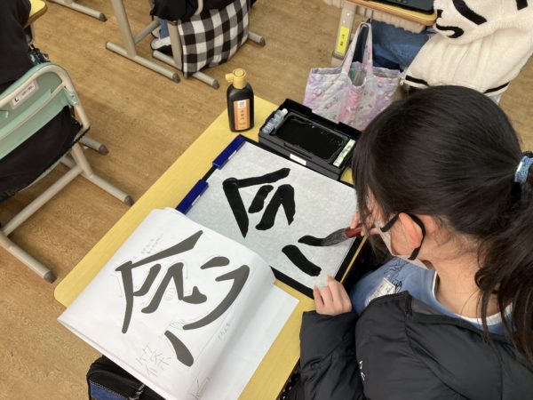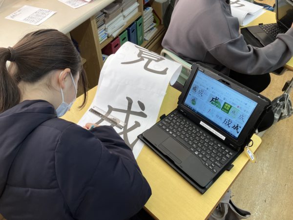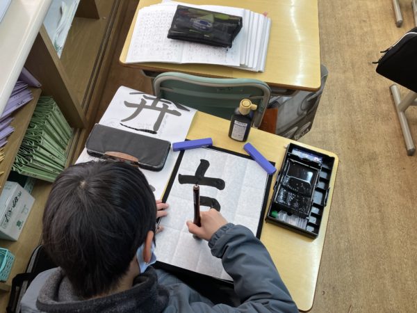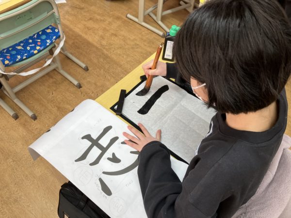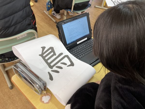 2025年1月31日 / 最終更新日時 : 2025年2月2日 明野小 6年生 漢字四字に思いをこめて 6年生は卒業制作として、毛筆の作品にも取り組んでいます。 漢字四字で、自分の好きな言葉や目標とする言葉、自分の名前が入った言葉などを選び、練習を始めました。 最初にパソコンを使って、書き順や上手に書くコツを調べお手本に書き込みました。 次に半紙に練習していきます。 いつも使っている筆よりも太い筆を使って書きます。 半紙で練習を重ねたあとに本番の用紙(条幅)に清書し、卒業式の会場に展示する予定です。