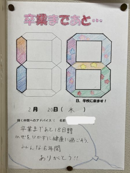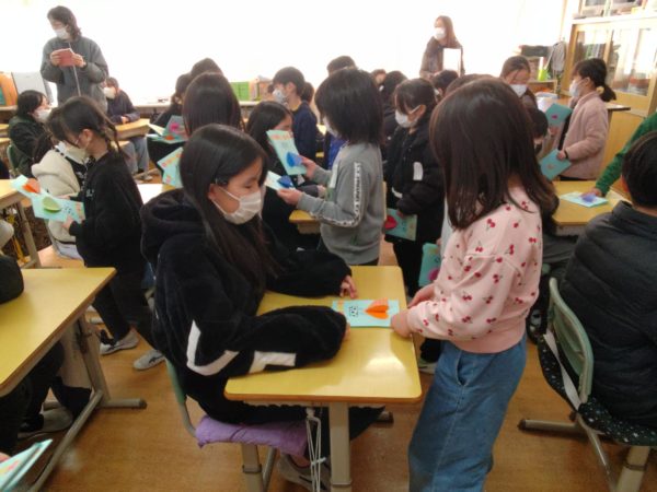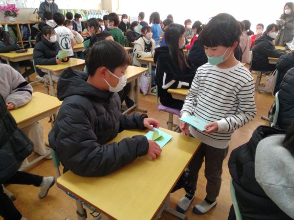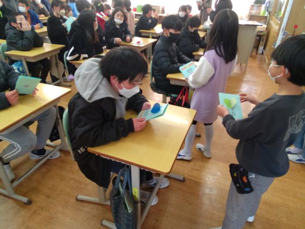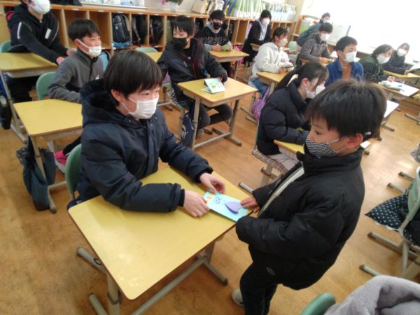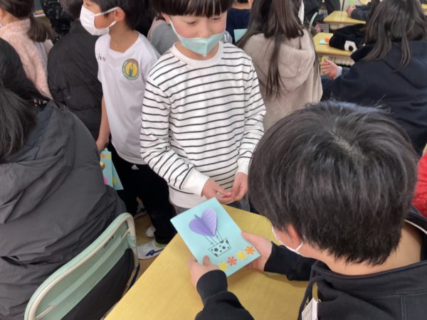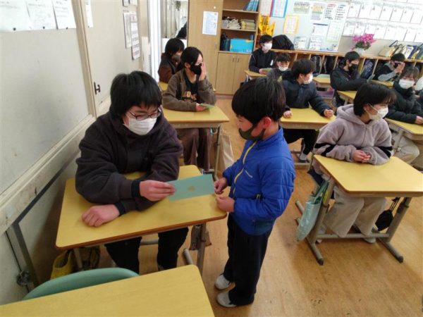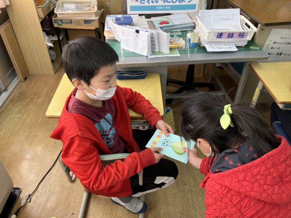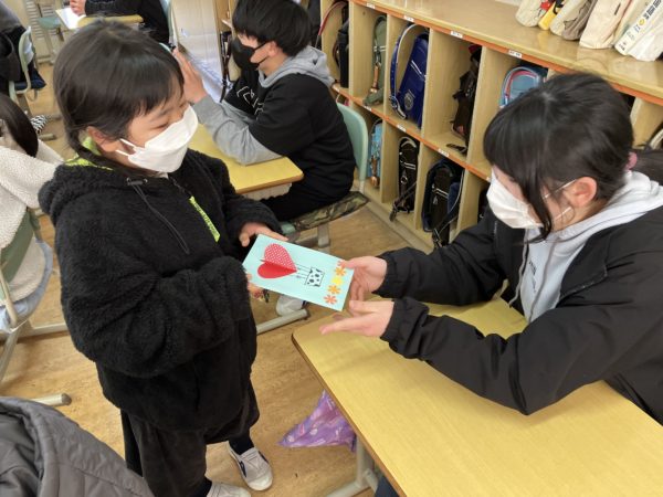 2025年2月20日 / 最終更新日時 : 2025年2月20日 明野小 2年生 招待状をありがとう! 6年生のカウントダウンカレンダーが20日を切りました。 今日は6年教室にかわいいお客さんがやってきました。 2年生が手作りの「6年生を送る会」招待状を届けに来てくれました。 同じ縦割り班の6年生あてに作ってくれたそうです。 一人一人に言葉を添えて渡していました。 6年生は渡された招待状を嬉しそうに見ていました。 2年生のみなさん、ステキな招待状をありがとう。