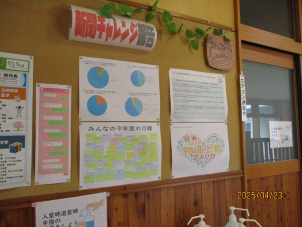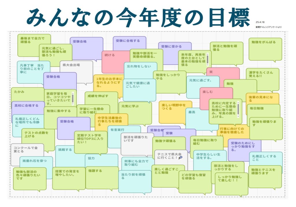 2025年4月23日 / 最終更新日時 : 2025年5月7日 01post 図書館 R7みんなの目標 明野中では、毎月第一・第三金曜日の朝に「新聞チャレンジ」という新聞記事・ニュース記事を読んで答えるクイズを行っています。 今年度一回目となる4/18は「関税とは?誰が払うの?経済はどうなる?」というテーマでしたが、その内容とは全く関係のない「あなたの令和七年度の目標は?」という設問にも皆、しっかり答えてくれましたので、今回はそのアンケート内容をお届けします。 ちなみに、新聞チャレンジの結果は図書館前に掲示してありますので、そちらも是非ご覧ください。