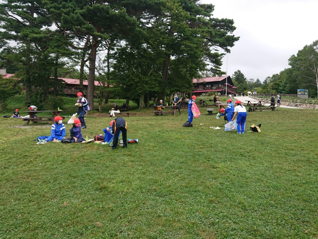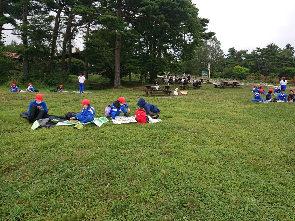 活動班での最後の活動。班ごとにシートを広げ、おにぎり弁当をいただきます。ここでも向き合うことはしません。