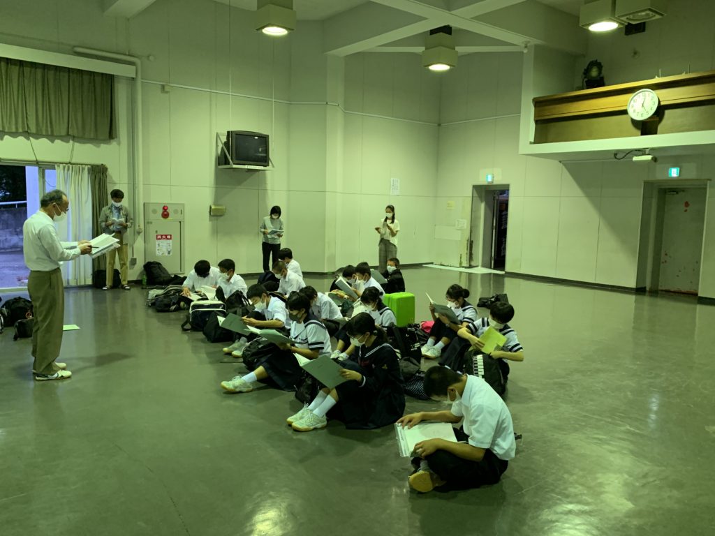 一日の最後は学活。写真は各班の代表が、今日の成果と課題を発表しているところです。校外学習一日目、お疲れさまでした。明日に備えて、ゆっくり休みましょう。