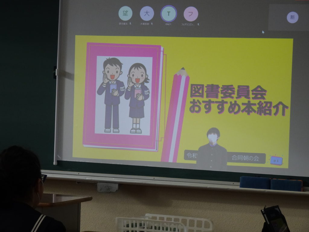 2022年1月28日 / 最終更新日時 : 2022年1月28日 白州中 その他 合同朝の会 新型コロナウイルス感染防止のために、24日の合同朝の会はTeamsを使ってリモートで行いました。内容は、図書委員会1年生による「おすすめの本の紹介」です。 コメントを残すメールアドレスが公開されることはありません。 ※ が付いている欄は必須項目ですコメント ※ 名前 メール サイト
