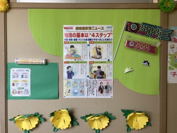 連休を終え,本日は朝NIEから始まりました。階段を上っていくと,今月の図書室前の掲示物が「こいのぼり」に変わっていました。家読は進んでいるでしょうか。この取組をきっかけに,本に出会い,その内容を家族と交流することで,家族間でのコミュニケーションがさらに豊かになることを願っています。