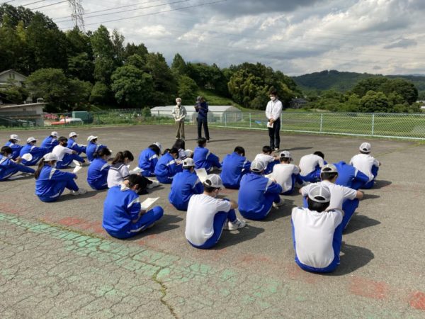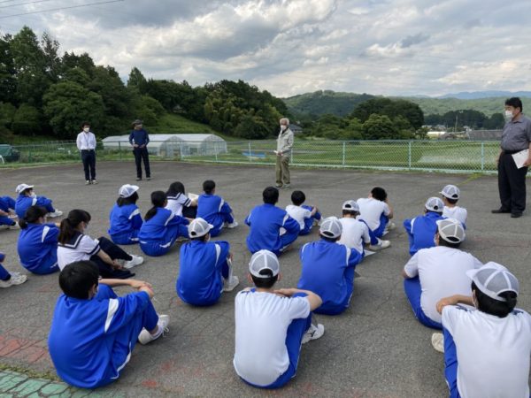 この日,中学校北の駐車場近くの水田で「有機農業」についての学習会を行いました。この水田では「食から見つめる人と自然のチャレンジ 北杜プロジェクト」として「アイガモロボ」を用いて有機栽培を行っています。講師に北杜市役所の浅川様,学校評議員でありこの水田の持ち主の井上様,有機米デザイン株式会社の内藤様を迎え,それぞれのお立場から講話をいただきました。