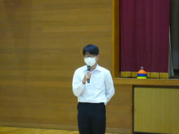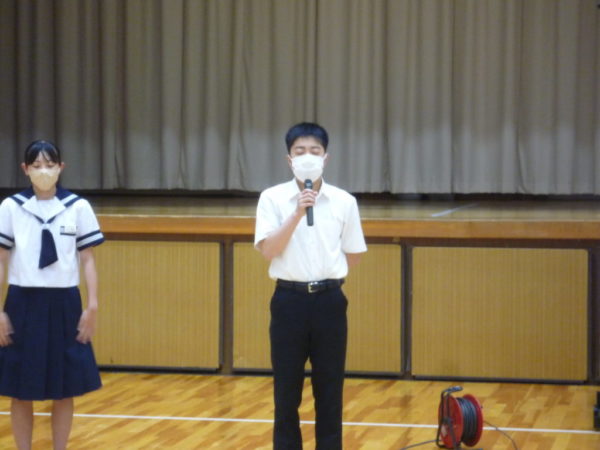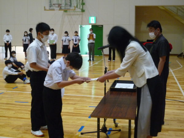 この日の合同朝の会は,先日行われた峡北支部総合体育大会の報告と表彰式が行われました。