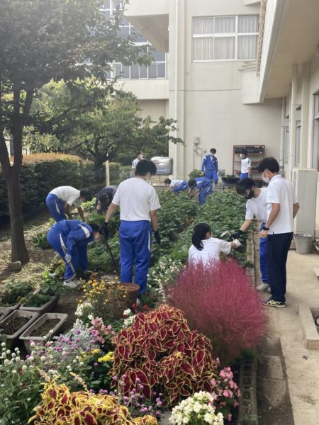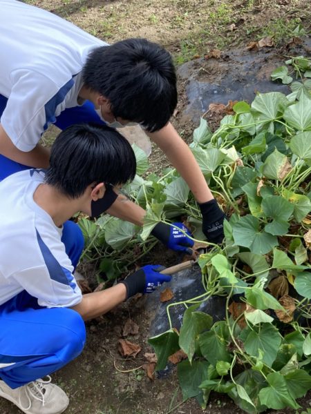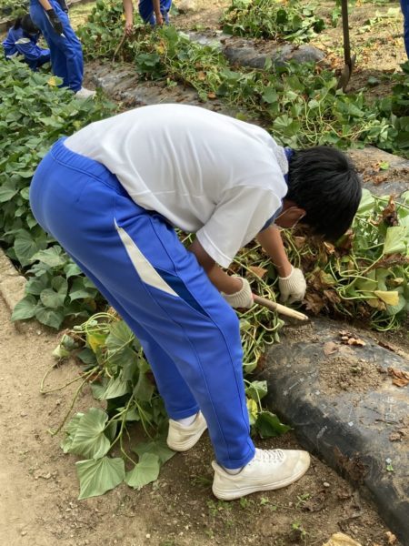 ③ 2年技術科の授業では,校舎前の花壇で育てたさつまいも掘りの準備として「つるきり」をしました。31日の焼き芋集会に向け,着々と準備が進められています。