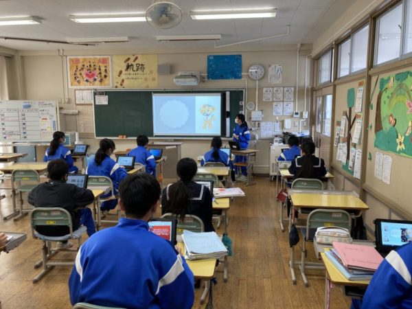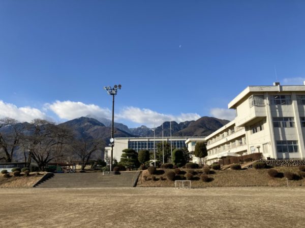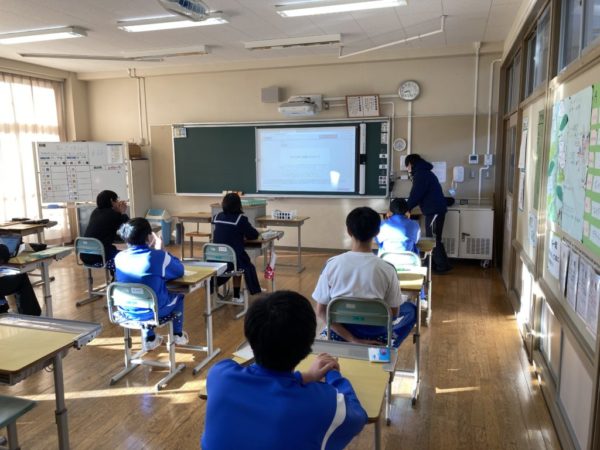 生徒玄関に登場したクリスマスツリー。プレゼントの中には何があるのでしょうか。夕方になるとライトが点灯し,素敵な雰囲気となります。1年生英語の授業の様子です。「He is ~」「She is ~」を用いて自分の決めた人物の紹介をしていました。発表後にALTの先生からアドバイスをいただきました。こちらは1年生家庭科です。リンゴの皮むきの実習を行いました。2年生の学活。冬休み一人1台端末の持ち帰りについての説明がありました。タイピング課題について説明では,ランキング機能があることも紹介され「目指せゴールド」といったお話しもありました。校庭から見える周囲の山々は日に日に白くなってきています。冬の風景も素敵な本校周辺です。