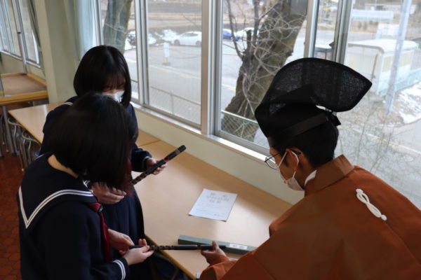 6校時、2,3年生合同「音楽」の時間に「雅梨会」のみなさんによる「雅楽学校訪問授業」が行われました。生徒が入場する際に「平調 五常楽(ひょうじょう ごしょうらく)」が流れ,格調高く授業が始まりました。「平調 音取(ひょうじょう ねとり)」や「平調 越殿楽(ひょうじょう えてんらく)」を実際に鑑賞しました。