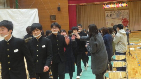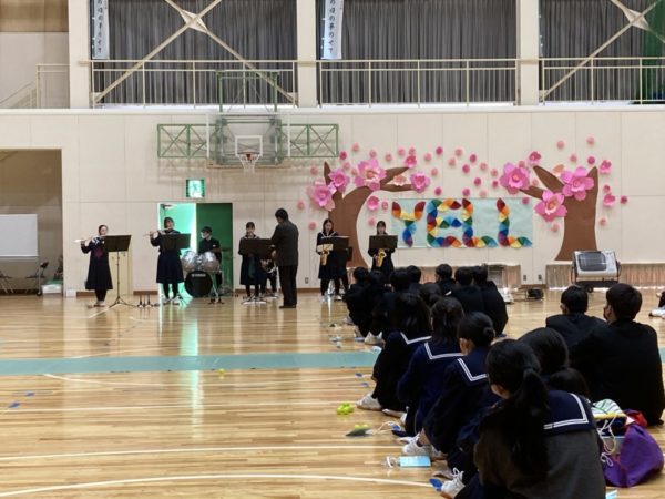 2023年3月7日 / 最終更新日時 : 2023年3月7日 白州中 その他 3月6日 3年生を送る会 この日,新生徒会本部が企画運営をした「3年生を送る会」が開催されました。 体育館の壁面には本年度のテーマが装飾部門によって作成されました。 SDGs活動に力を入れた本年度を象徴するために,レインボーカラーで仕上げました。(装飾部門からのあいさつより) 吹奏楽部からは「エール」「友よ~この先もずっと…」の演奏。 1,2年生から「応援」と「合唱 空も飛べるはず」が贈られました。 「スライド・ビデオレター」 1,2年生の頃お世話になった先生方からメッセージも届きました。 1,2年生から手作りの思いを込めたプレゼントが渡されました。 今日までの感謝の気持ちをこめて、3年生より「エール」と合唱がありました。 退場シーンです。参観していた保護者の方を含めて花道を作り,送りました。 この日いただいた招待状とプレゼントを手にしての記念写真。本年度1番の笑顔溢れる写真となりました。 実に心温かい会となりました。3年生と過ごす期間はあと3日。たくさんの思い出をつくって,卒業式を迎えたいと思います。