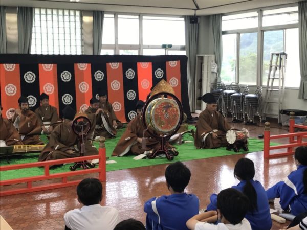 この日,1,2年生の合同音楽で雅梨会の皆様による「雅楽体験授業」が行われました。雅楽の演奏が流れる中,入場しました。