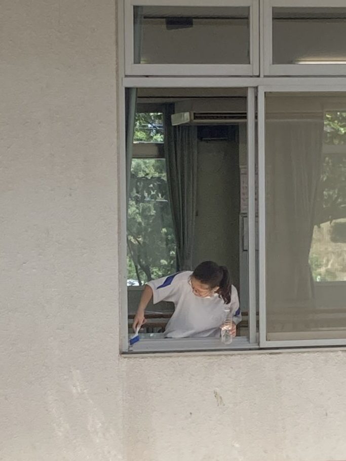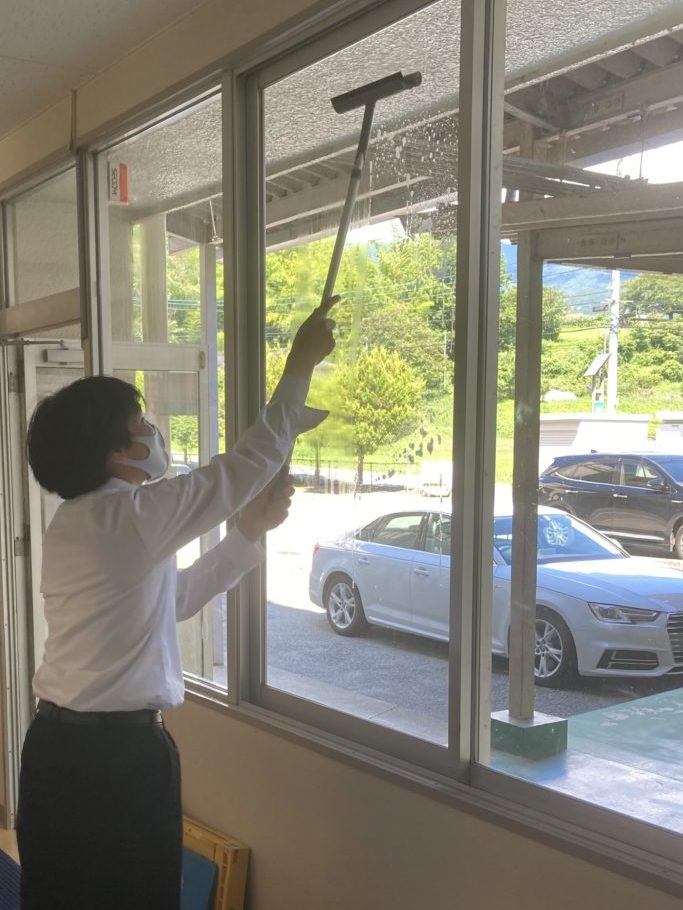 教室の担当は二名。小規模校なので,一人一人の分担箇所が広いです。雑巾がけはモップを使う等,工夫しています。