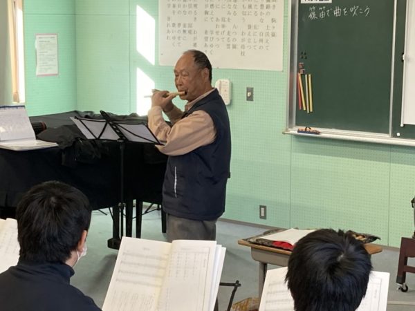 1年生にとって,初めての「篠笛」体験。「お神楽」といった郷土芸能で演奏している姿を見たことや聞いたことはあったようですが,実際に演奏して新たな発見があった様子です。「地域のお神楽を支える人材につながっていくといいのですが」と講師の方々がお話になるほど,技術を体得した生徒がいたようです。