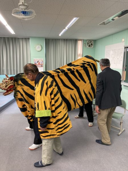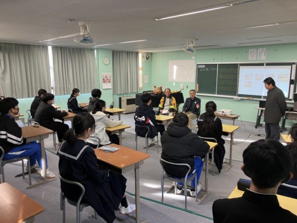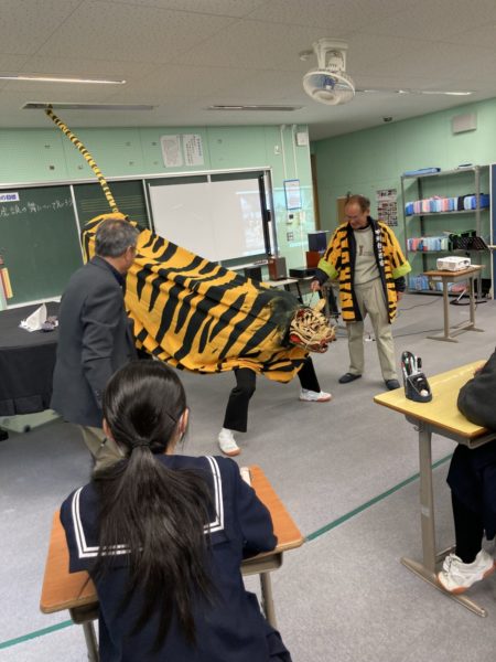 6校時,2年生音楽では甲州台ヶ原宿虎頭の舞保存会の方を講師に迎え,伝統芸能について学びました。