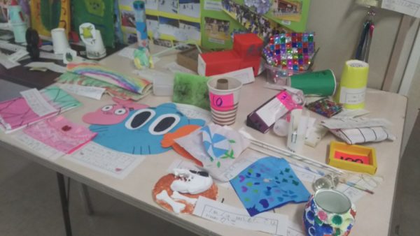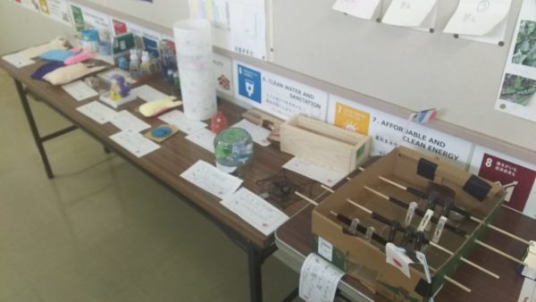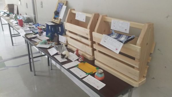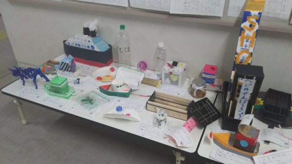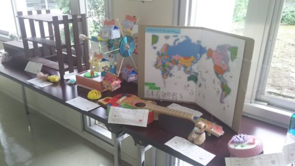 中央廊下に夏休み中に作った全校児童の作品が展示されました。飾るもの、遊べるもの、使えるものなど、一生懸命に取り組んだ様子がよくわかります。