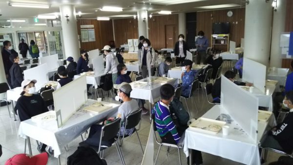 バスレクで盛り上がっています。発言する時は、飛沫を避けてホワイトボードで答えています。