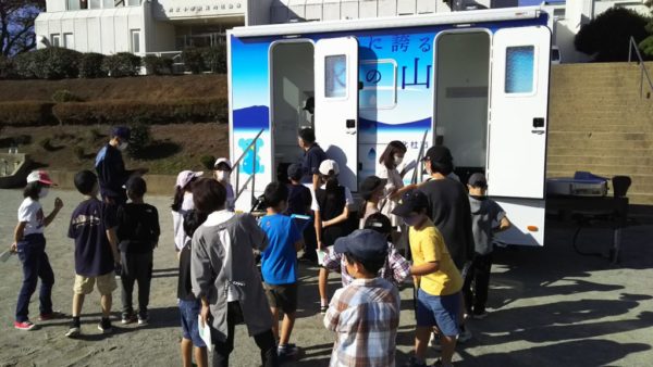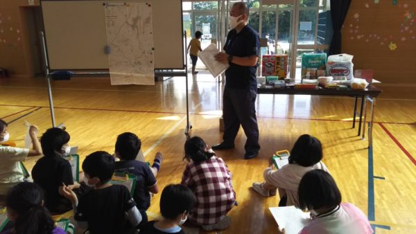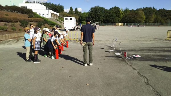社会科の「自然災害に備える町づくり」の勉強で、消防防災課の方をお招きしました。トイレトレーラーの見学や消火器体験などを行いました。