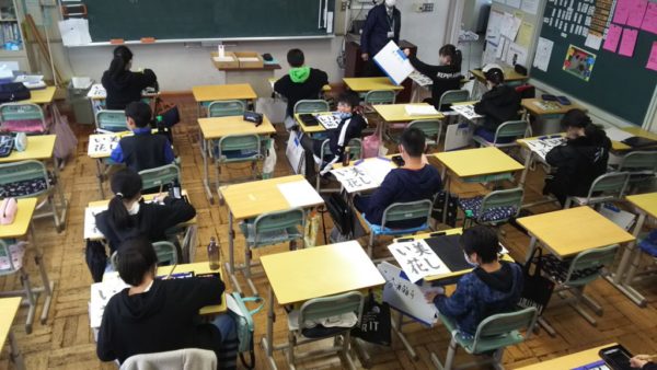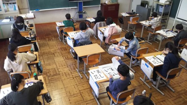 書写の時間です。書き初め大会の課題「美しい花」を練習しています。