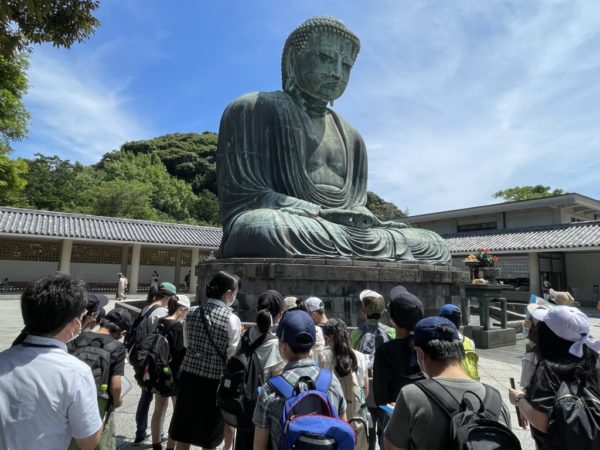 高徳院で大仏を見学しています。大仏の大きさにビックリ‼️