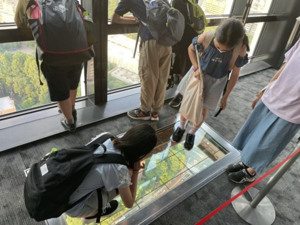 東京タワーでは、メインデッキから街の様子や遠くの景色を眺めました。真下が見えるガラスの床では、みんなが興味深く下の様子を見ていました。