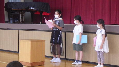 「静かに集まる」風通しのよい1学期終業式が終わりました。「優しいクラスになるために自分が頑張りたい。」「夏休みの宿題を早く終わらせたい」・・・などの感想を児童代表の3人が発表しました。コロナウィルスに気を付けながら充実した夏休みを過ごしてほしいです。
