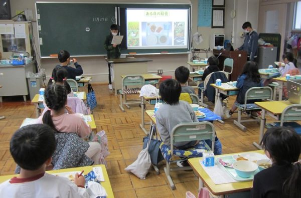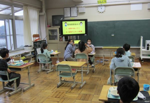 今日は、給食の時間にパワーポイントの資料を使って各クラスで「食事のあいさつ」について給食委員会の人が教えてくれました。「御馳走様」の由来などについて知りました。また事前に行った「好きな給食アンケート」を委員会の人たちがタブレットPCを活用して、表にまとめたことを発表することもしていました。