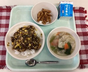 もずく丼 牛乳 わんたんスープ 米粉ほうとうのかりんと