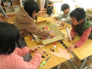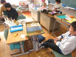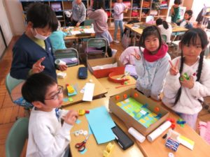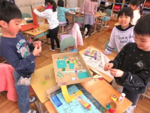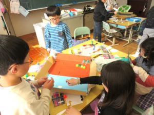 今日の図工のゴールは、先週から作り始めたすごろくゲームを完成させて遊ぶことでした。グループごとにジャングル、海、宇宙などの場面があって、そこに合うようなすごろくを作ります。例えば、海のグループは、「クラゲにさされて1回休み」とか、「カメの背中に乗って3こ進む」のように、お話を考えながら作っていました。3~4人のグループで協力しながら楽しく作り、出来上がってサイコロを振るときには、大きな歓声が上がりました。「ほかのグループのも遊びたい。」と言っていたので、寒い日などに活躍しそうです。