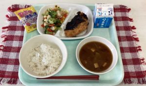 麦ごはん 牛乳 味噌カツ ブロッコリーのチーズおかか和え 赤だしのみそ汁 おさつスティック