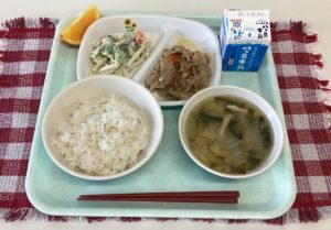 麦ごはん 牛乳 豚肉のしょうが炒め マカロニサラダ 小松菜と油揚げの味噌汁 オレンジ