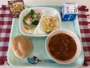 リングパン 牛乳 じゃがいものみそチーズ焼き 花野菜サラダ ポークビーンズスープ さつまいもチップス