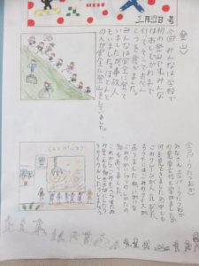 今日は習字の授業があり、普段とは少し違った顔が見られたので紹介します。自分の字に集中し、よりよい作品にしようと何枚も何枚も練習している姿が立派でした。係の活動も紹介していきます。今日は、ニュース係とニコニコ係です。ニュース係さんが発行した新聞には、八ヶ岳登山とエコパークたつおかの見学のことが書かれていて、カットも素敵です。ニコニコ係さんは、毎月季節に合わせた飾りで教室をきれいにしてくれています。6月はアジサイやアサガオ、カエルなどの飾りがかわいいです。自分たちで考えて活動しているところが素晴らしいです。気温が上がってきて、ヘチマの芽も出てきました。ヘチマも子どもたちもすくすく育っています。