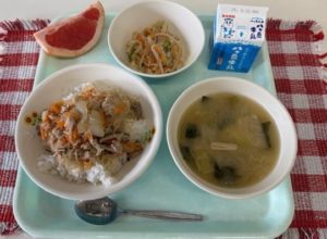 豚丼 牛乳 大根サラダ 凍り豆腐のみそ汁 グレープフルーツ